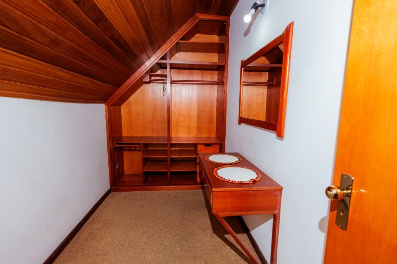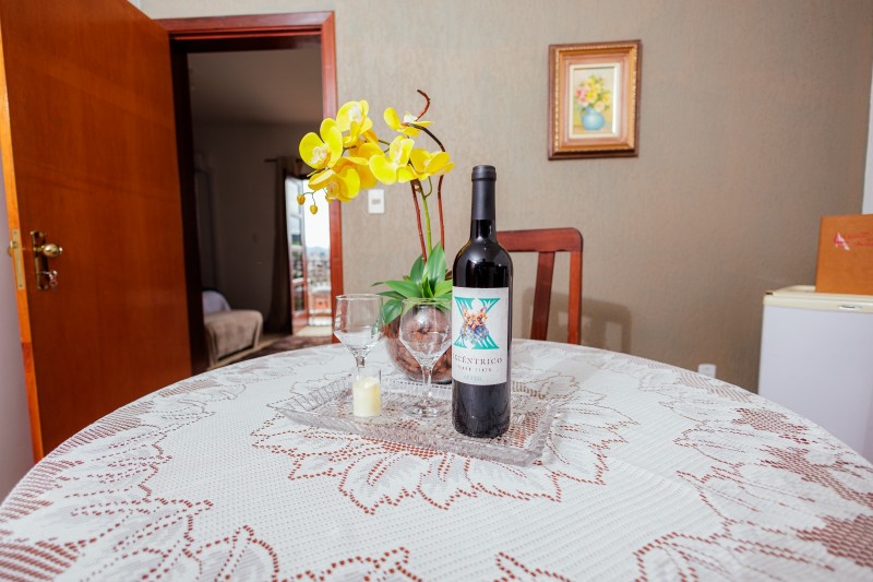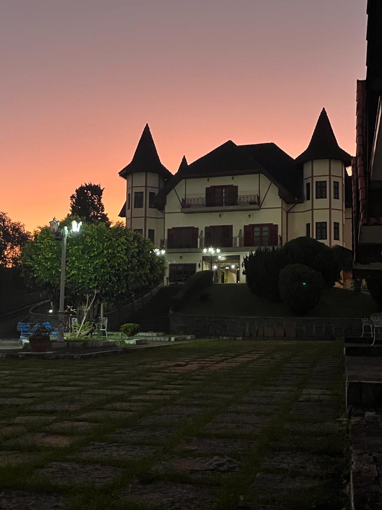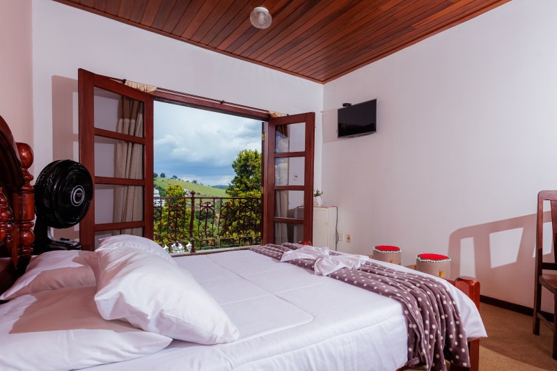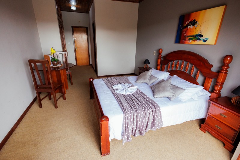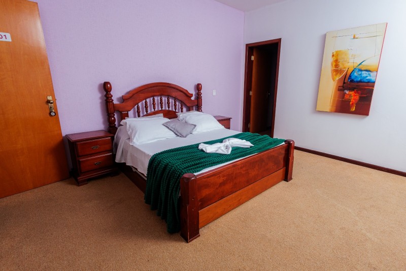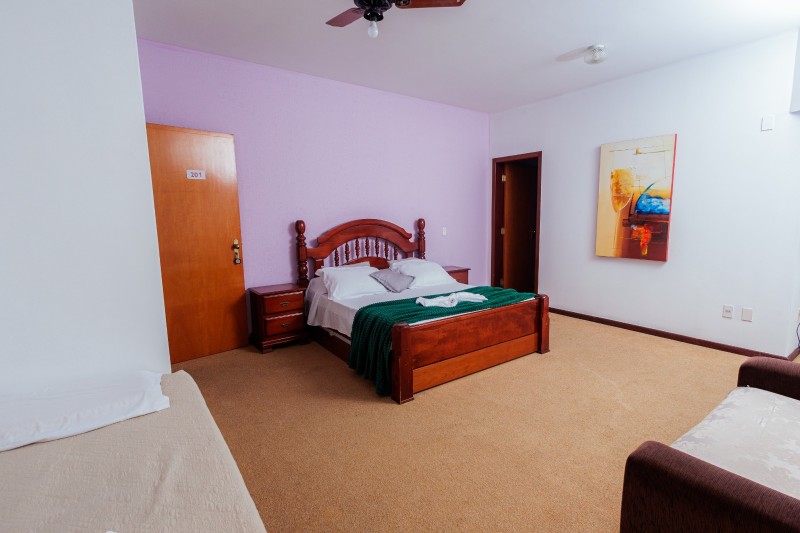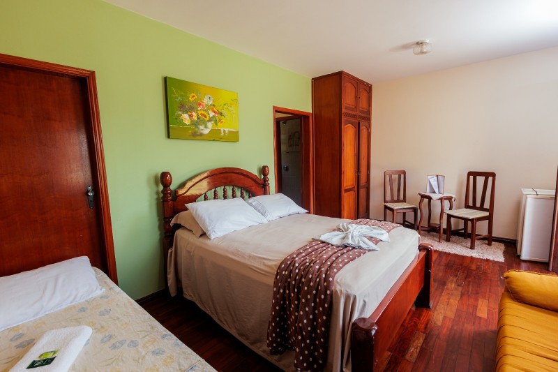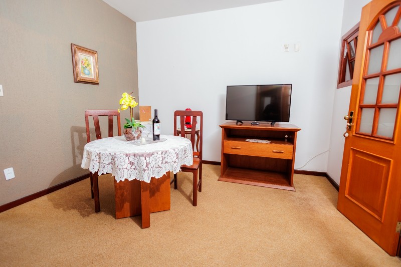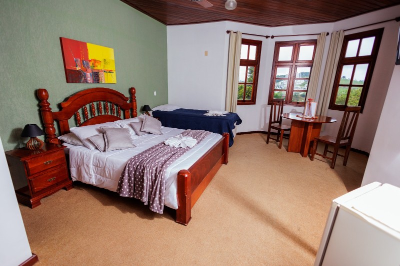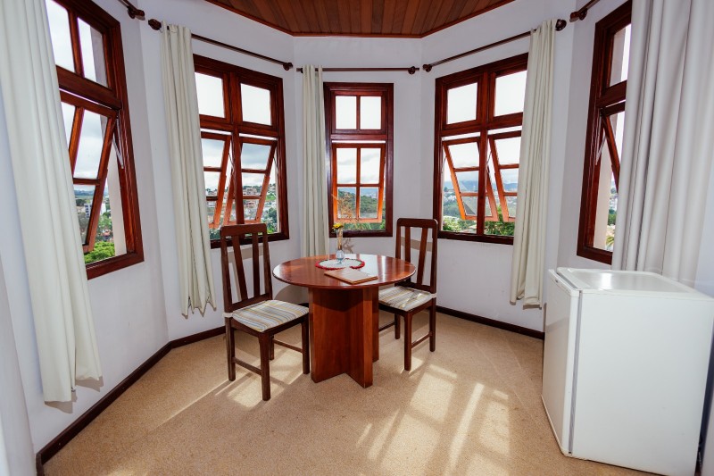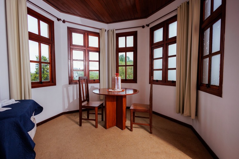 A Suíte Torre do 2º andar dispõe de hidromassagem individual, oferecendo uma experiência de maior conforto e relaxamento. A acomodação é equipada com TV, frigobar, closet, ventilador de teto e mesa com cadeiras. Todo o ambiente possui piso em carpete, garantindo um espaço aconchegante.