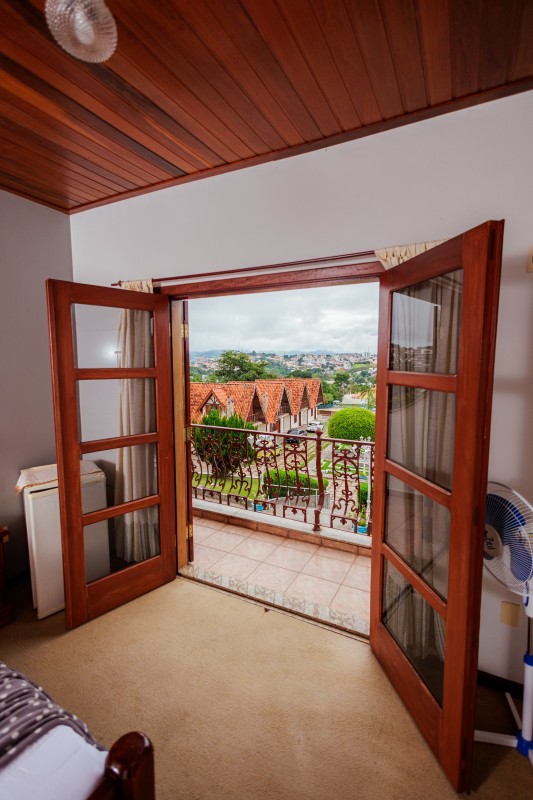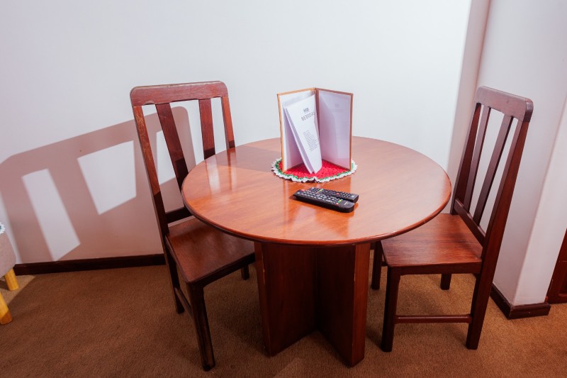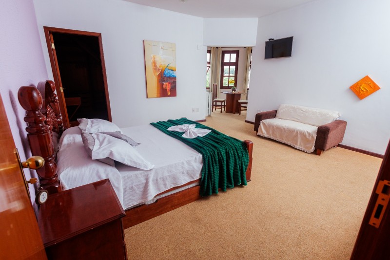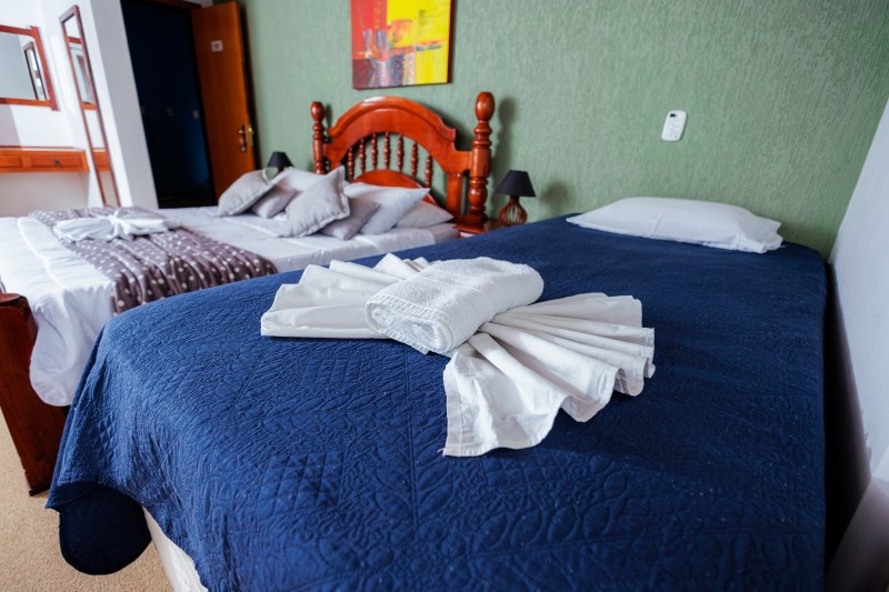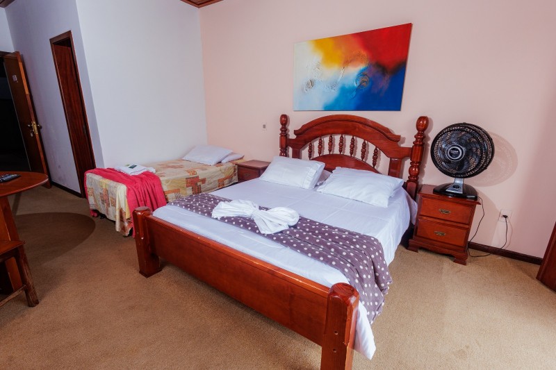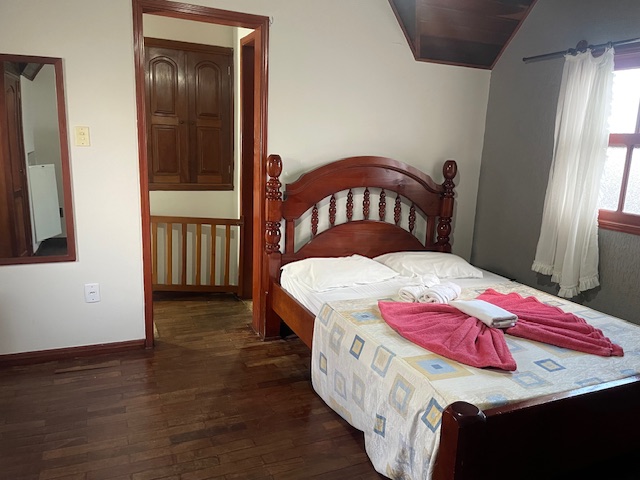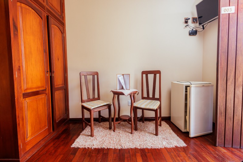 Os chalés estão distribuídos em piso térreo e piso superior, localizados próximos ao anexo da piscina. Todos os chalés possuem piso de madeira e são equipados com frigobar, TV e ventilador de teto, garantindo conforto durante a estadia. Não há mesa nem cadeiras no interior dos quartos, priorizando um ambiente mais compacto e funcional.