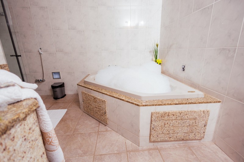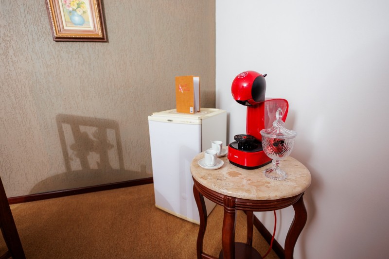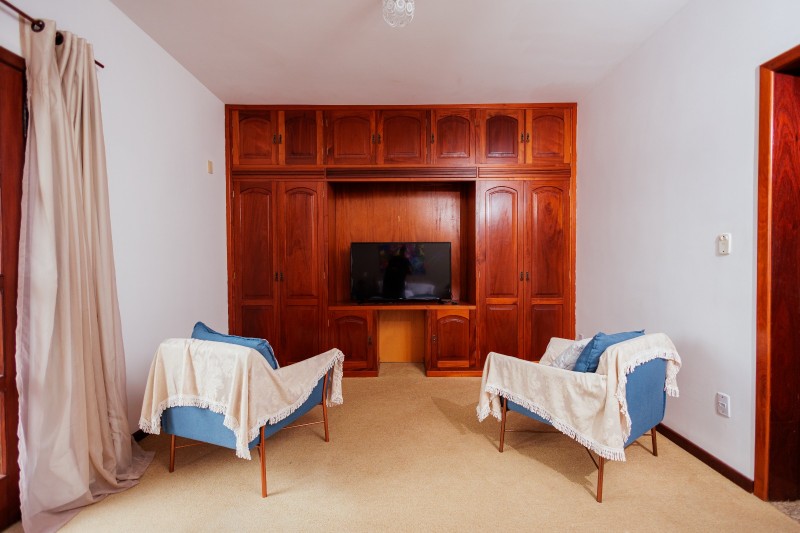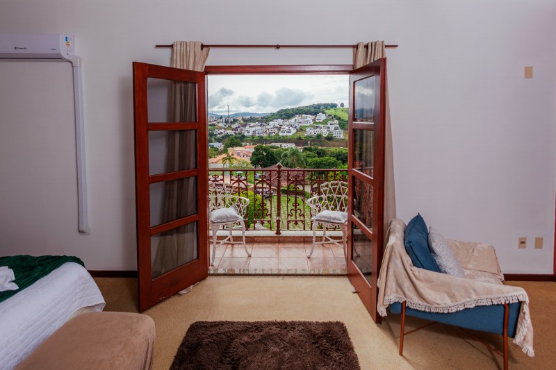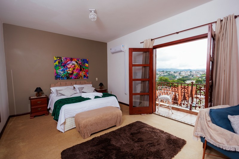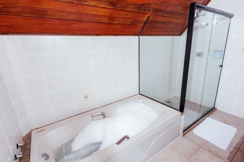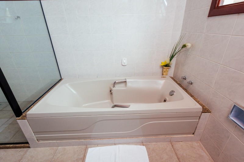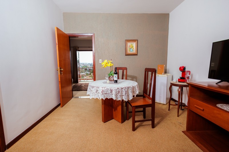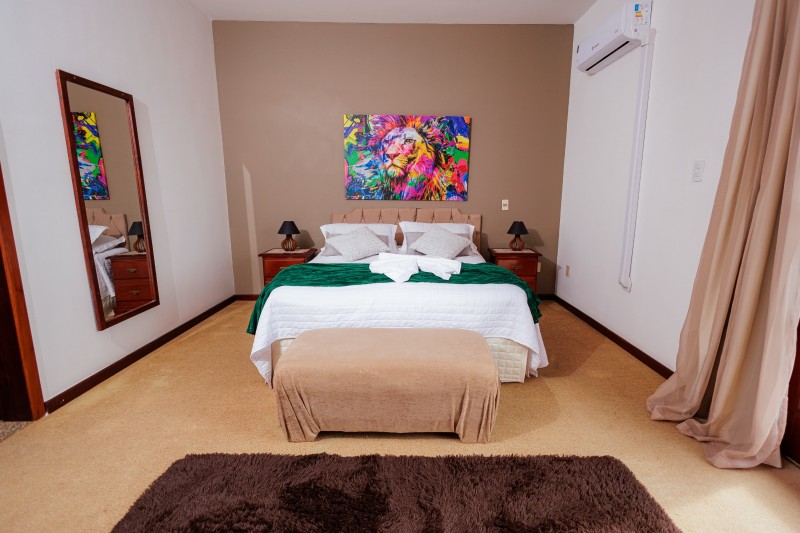 A Suíte Master dispõe de hidromassagem dupla, oferecendo uma experiência de conforto e relaxamento. A acomodação conta com ar-condicionado, frigobar e mesa com cadeiras. Possui duas televisões: uma Smart TV no quarto principal e outra na antessala com canais abertos. Todo o ambiente possui piso em carpete, garantindo um espaço aconchegante e sofisticado.